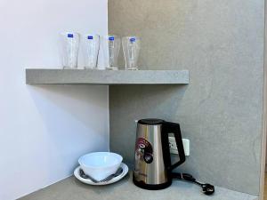Additional conveniences include a refrigerator in the kitchenette area along with bathroom essentials like a hairdryer, shampoo, and body soap. Safety measures comprise an in-room fire extinguisher and smoke detector to ensure peace of mind during your stay.