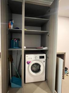Inside the air-conditioned unit, there is one bedroom with one bed, a fully equipped kitchen including a kitchenette area, and one private bathroom. Additional amenities include a washing machine and a flat-screen TV for entertainment.