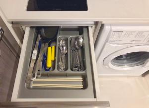 The apartment features one bedroom with one bed, a living room, and a fully equipped kitchen including a stovetop, refrigerator, microwave, electric kettle, dining table and kitchenware. The bathroom includes complimentary toiletries such as shampoo and conditioner as well as slippers, a walk-in shower without steps, bathtub or shower options plus a hairdryer. Additional in-room amenities comprise air conditioning, bed linen, towels, wardrobe or closet space hardwood flooring and clothes drying rack.